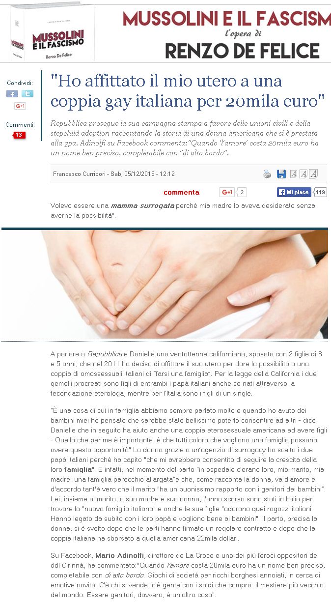 Ovviamente anche Il Giornale si è accodato alla propaganda anti-gay di Adinolfi, sostenendo che sia una vergogna che i gay possano avere figli (dato che in Russia o in India ci devono poter andare solo gli eterosessuali). Il tutto sollevando la solita reazione violenta dei suoi lettori, divertiti ad insultare la madre. C’è chi dice che «si sente donna ma si comporta consenzientemente da mucca» o chi commenta: «Amor amore, del puttanesco sentimento… chissà chi dei due se la sarà trombata». Non manca poi il ritornello del «ma non si pensa mai al futuro del nascituro» prima di sentenziare «Vi dovete semplicemente vergognare, feccia dell’umanità».