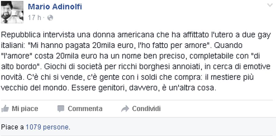 dopo il clamoroso insuccesso del suo sciopero (a cui non ha partecipato praticamente nessuno) Mario Adinolfi pare aver scelto di rispondere con la sua solita violenza. Ed è così che dalla sua pagina Facebook, l’esponente dell’integralismo cattolico ha pensato bene di dare della «puttana» alle donne che osano dare dei figli alle coppie gay